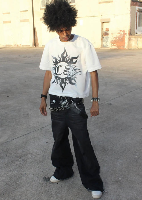 Black Flaming Sun Oversized Crop T☀️🏴☠️